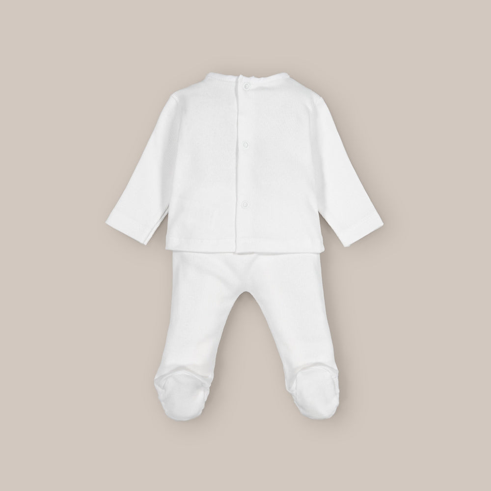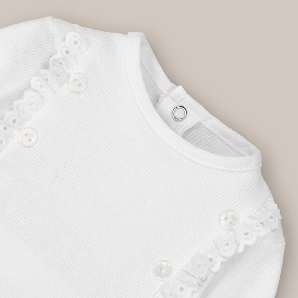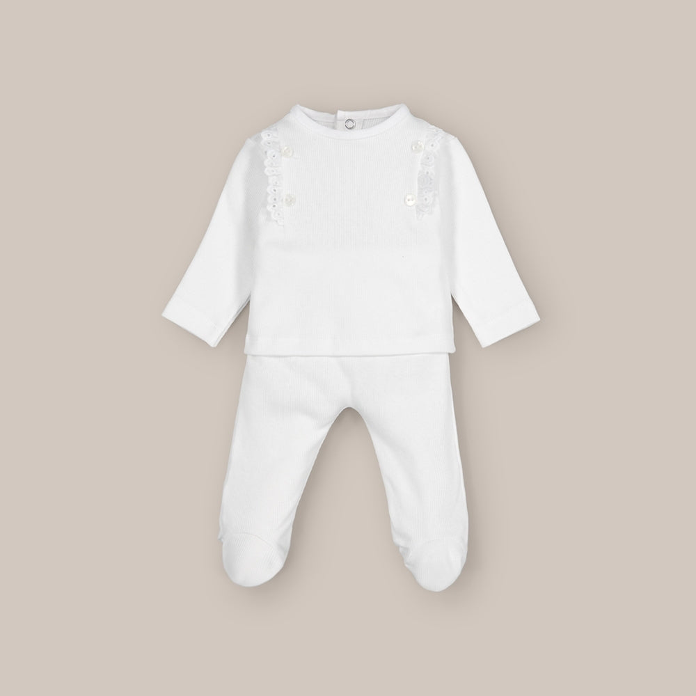 Conjunto 100% algodón 2 piezas para bebé formado por jersey con botones decorativos, detalle de puntilla y cierre trasero. También polaina para proteger los pies del bebé que proporcionan cobertura adicional a sus piernas manteniéndolas abrigadas y cómodas.