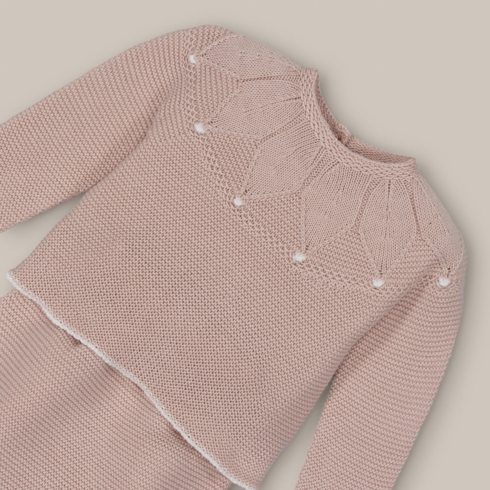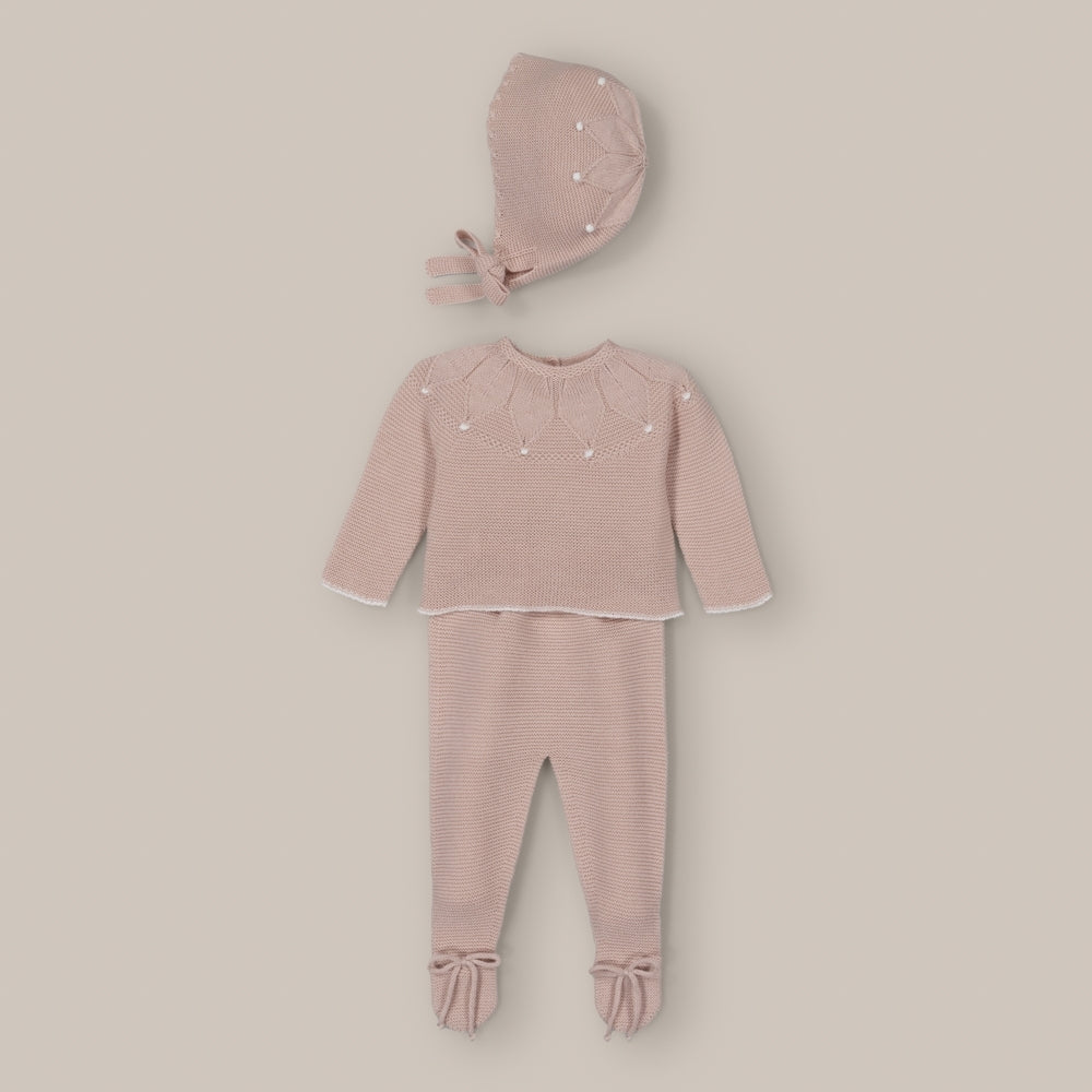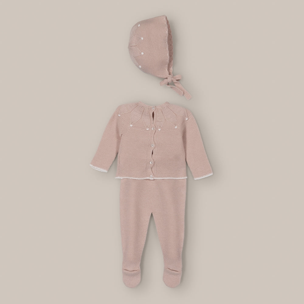 Conjunto de punto largo para bebé con jersey con detalles calados y bodoques,se cierra a la espalda con botones. Leggings y capota a juego.