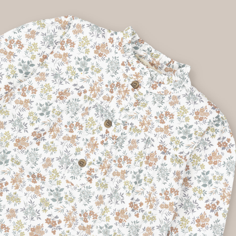 Blusa de niña de manga larga en bonita tela floral 100% algodón, con volante en cuello y puños. Cierre con media botonadura delantera de madera.