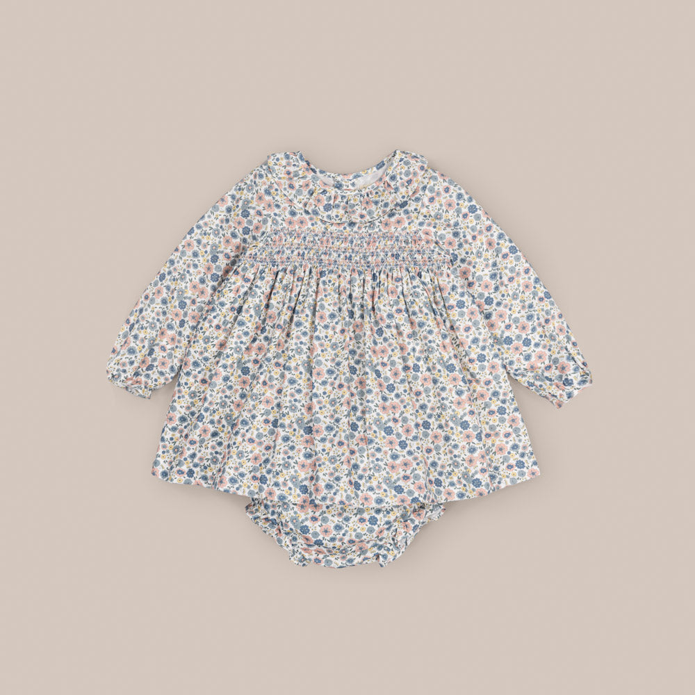 Vestido de bebé confeccionado en tela estampada 100% algodón con detalle smock en el pecho y detalle de cuello.Cuenta con cierre trasero y culote a juego con goma en cintura y perneras.Forro interior de algodón.