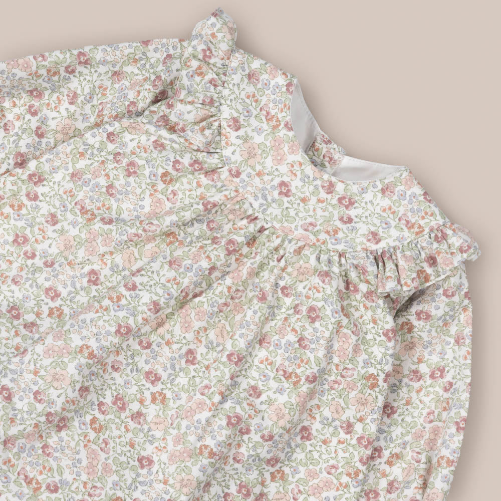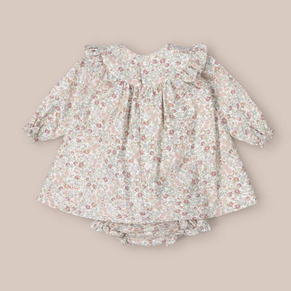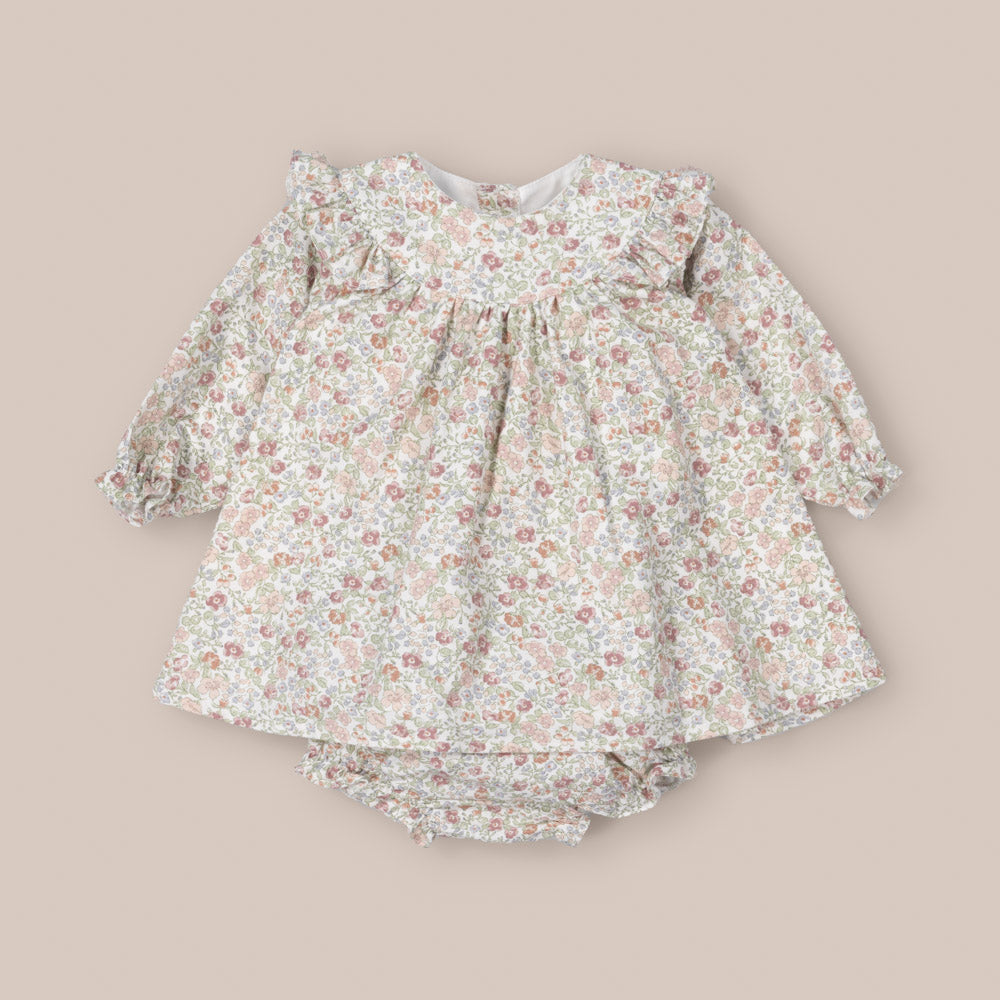 Vestido de bebé confeccionado en tela estampada de flores con detalle de volante. Cuenta con cierre trasero y culote a juego con goma en cintura y perneras