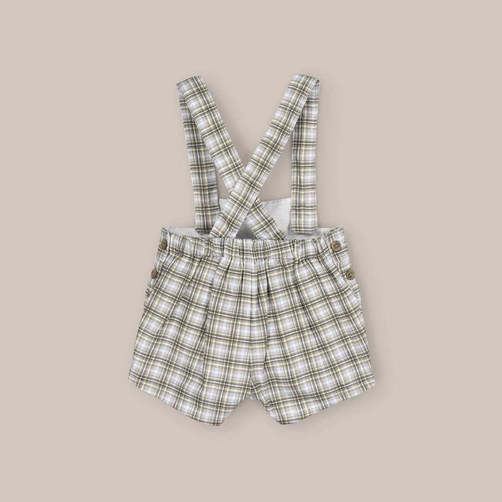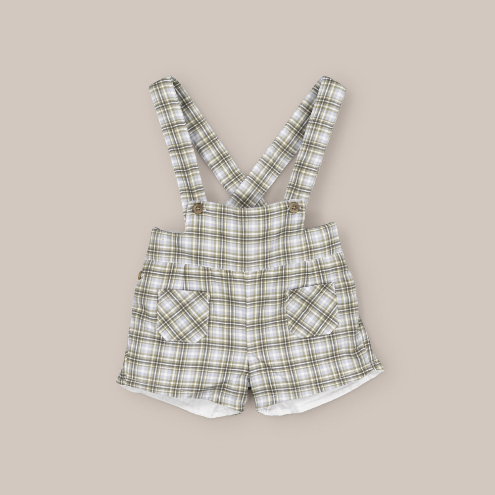 Pantalón de tirantes para niño confeccionado en tela de cuadros 100% algodón con bolsillos decorativos. Los tirantes cruzados se abrochan en la parte delantera con botones. Goma trasera para un perfecto ajuste.