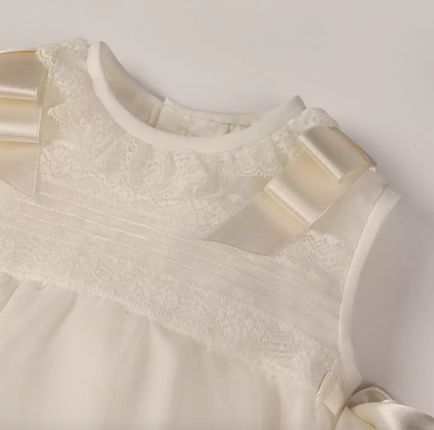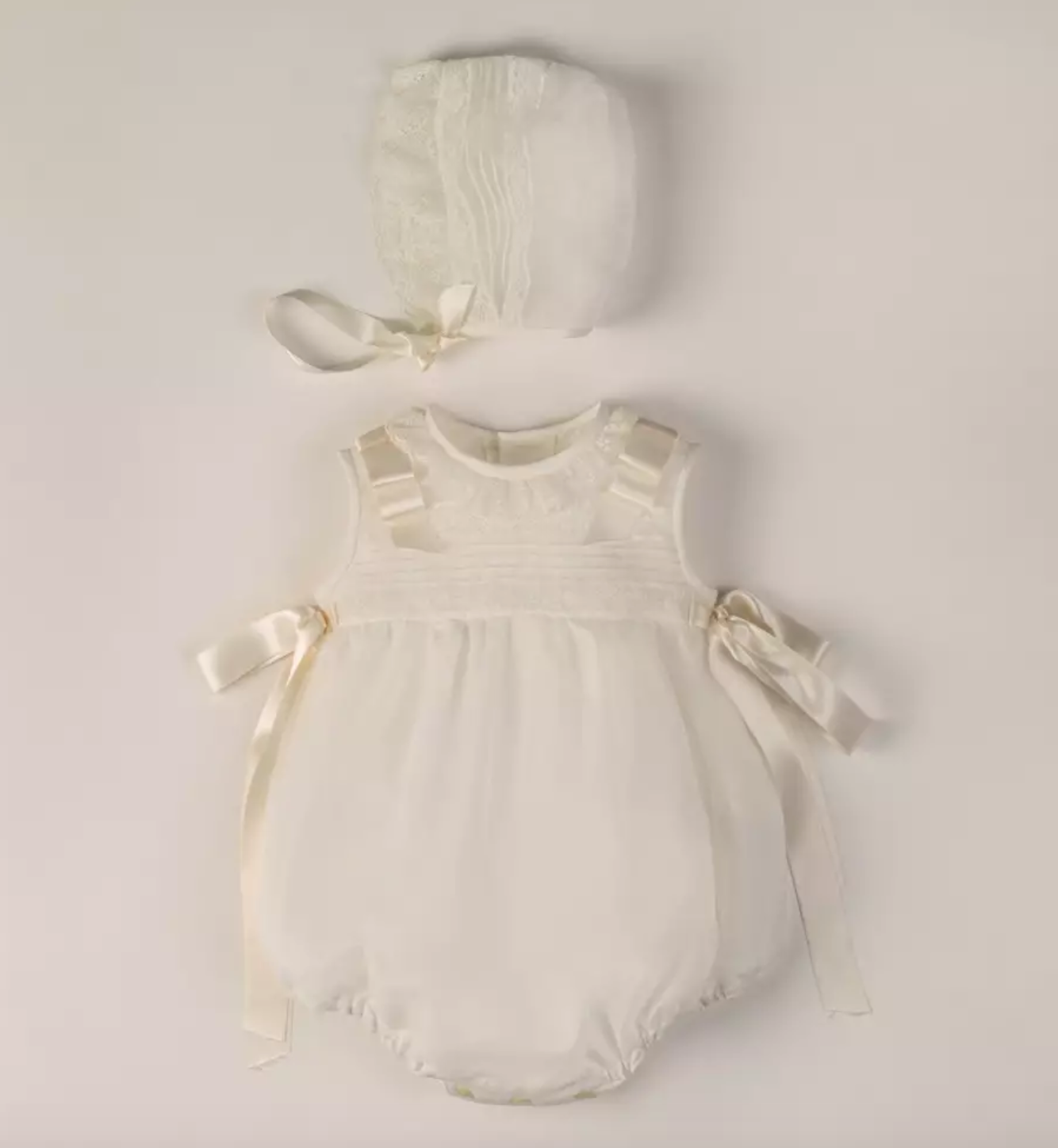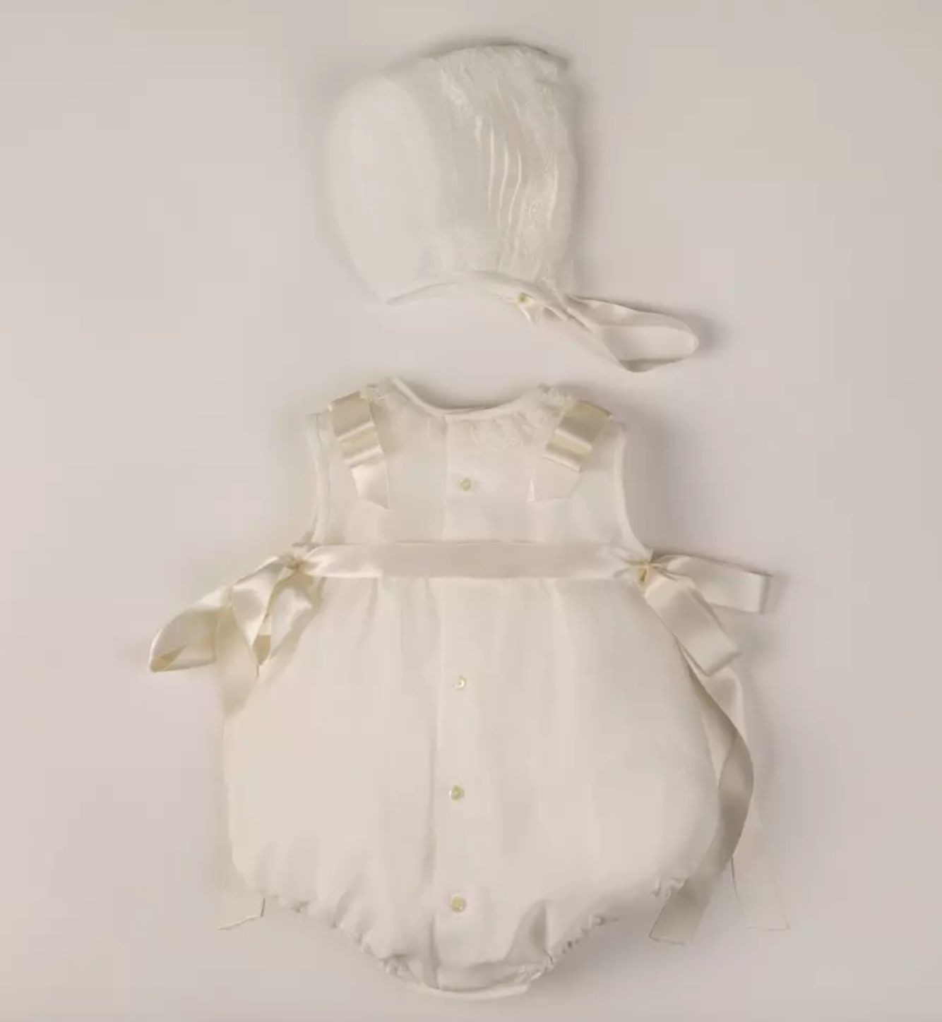 Pelele para la ceremonia del Bautizo con detalles de lazo en los hombros y costados y puntilla en el cuello y en el pecho. Incluye la capota a juego. Combinalo con los accesorios de ceremonia como toallas y chaquetitas de Doña Carmen.