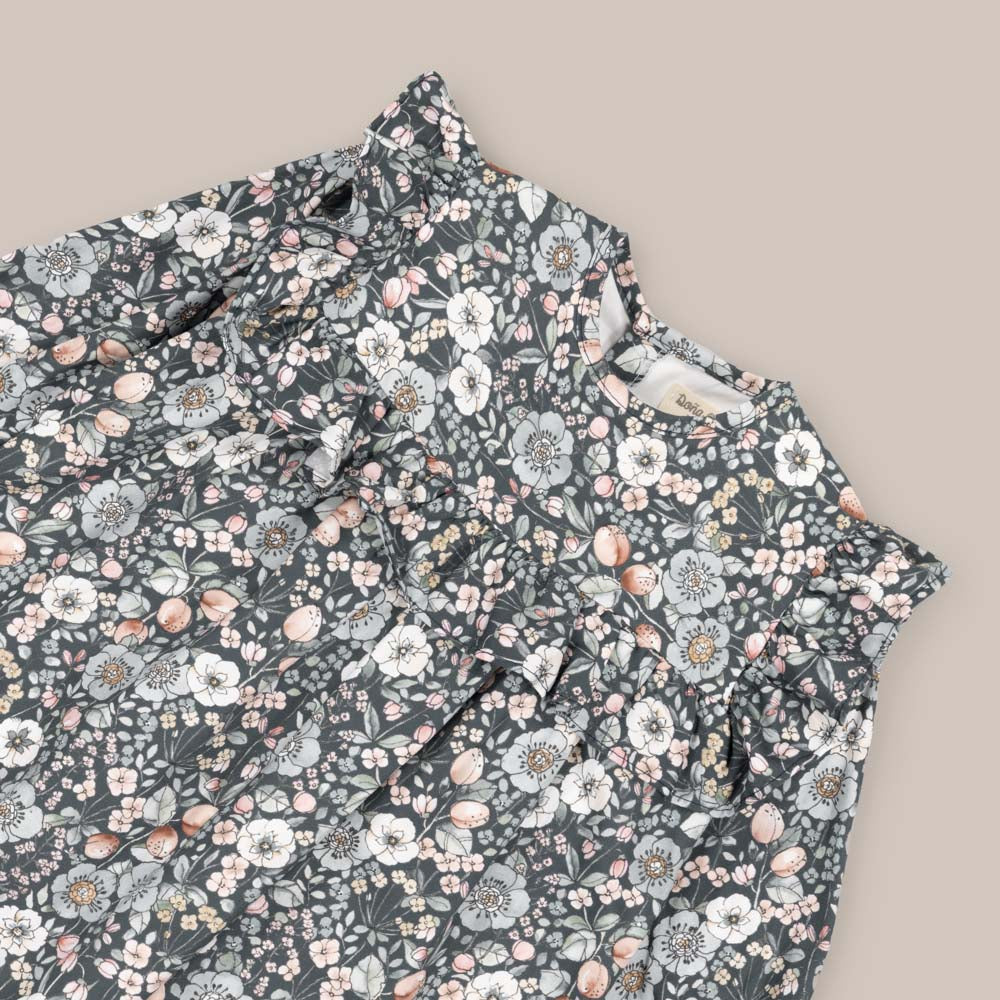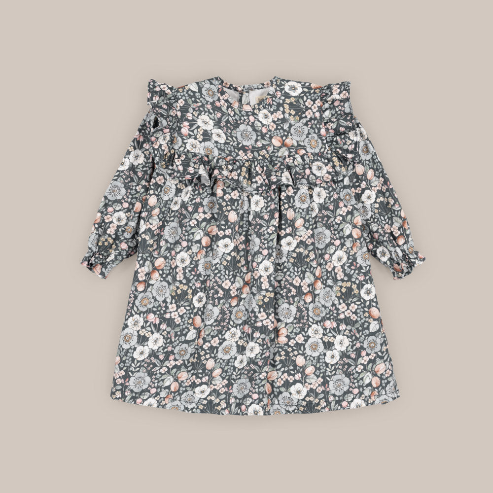 Vestido de niña confeccionado en tela floral con detalle de volantes en hombro y cierre trasero.